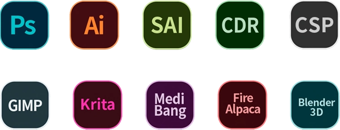 Adobe Photoshop、Illustrator、CLIP STUDIO PAINT、SAI、CorelDRAW(CDR)、GIMP、Krita、MediBang、FireAlpaca、Blender など、主要なデジタルアートソフトと高い互換性を誇ります。